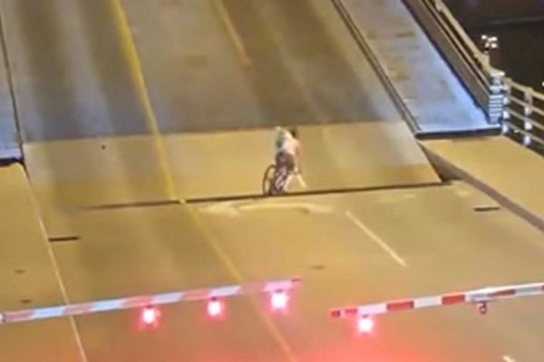 В следующий момент велосипедистка исчезает в проеме вместе с транспортным средством.Разведение моста пришлось остановить. Девушку госпитализировали с травмами лица.